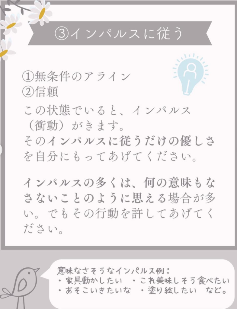 どのくらい「優しくするか」というと、そのインパルスに従うだけ自分にやさしくしてください。