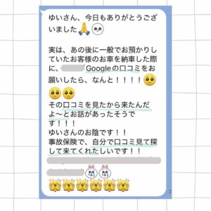 実は、あの後に一般でお預かりしていたお客様のお車を納車した際に、Googleの口コミをお願いしたら、なんと!!!