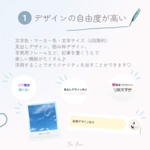 文字色、マーカー色、文字サイズ、見出しデザイン、囲み枠デザイン、写真フレームなど・・・